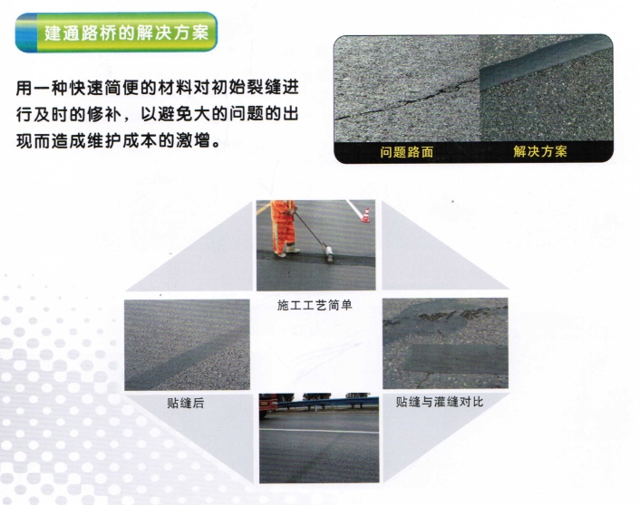 1、根据路面裂(接】缝的宽度选择所用贴缝带的规格,通常有8cm、12cm和24cm三种(也可根据客户要求定制);5mm以上宽的裂(接)缝选用至少12cm的贴缝带;5mm以下的裂(接)缝选用至少8cm的贴缝带。